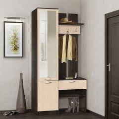 Прихожая имеет простой дизайн и прямые формы. Она состоит из вешалки с тумбой и пенала. Открытая вешалка оборудована полкой для головных уборов, тремя 3-х рожковыми крючками для одежды, ниже выдвижной ящик на роликовых направляющих, под ним открытая ниша с полкой. За распашными дверьми пенала три полки. Тип сборки и направление открытия дверей определеяется при сборке.